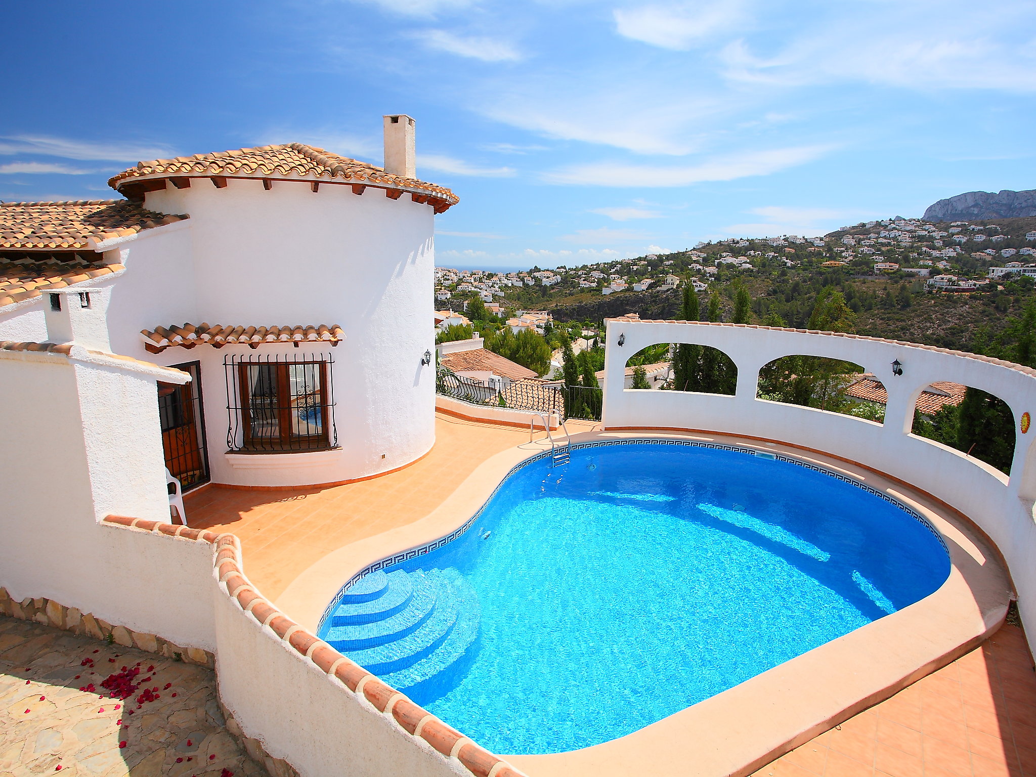 Very beautiful, comfortable villa "Suzanne". In the district of Monte Pego, in a quiet, sunny, elevated position, 8 km from the sea. Private: beautiful, well-kept garden with 800 m2, wildlife garden, flowers and trees, swimming pool kidney shaped (5 x 10 m, 01.01.-31.12.) with internal staircase. Parking on the premises. Shop 6 km, supermarket 6 km, restaurant 1 km, bar 1 km, sandy beach 8 km. Golf course 12 km, tennis 4 km.