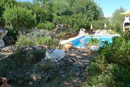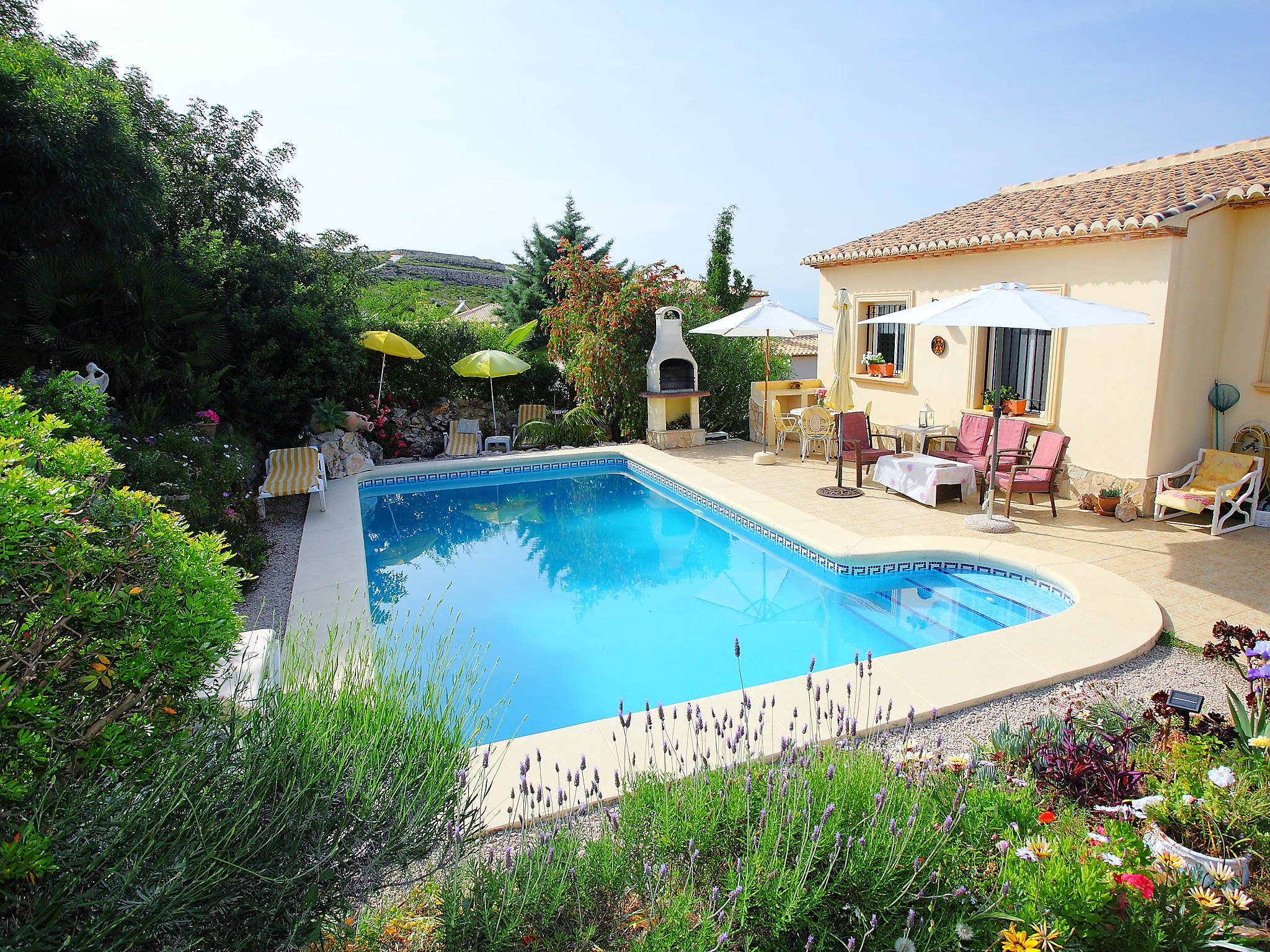 Rafol de Almunia: Very beautiful, comfortable house "Casa Maravilla". In the district of Almunia, in a quiet, sunny, elevated position on top of a hill, 10 km from the sea. Private: beautiful, well-kept garden 1'000 m2 (fenced) with wildlife garden, flowers and trees, swimming pool angular (4 x 8 m, 01.01.-31.12.) with internal staircase. Outdoor shower. Roofed, parking on the premises. Shop 2 km, supermarket 2 km, shopping centre 15 km, restaurant 1 km, bar 1 km, sandy beach 10 km. Golf course 20 km, tennis 4 km.Availability