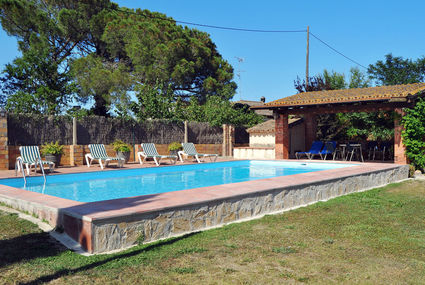 Feature: finca. Access/parking: gravel road, approx. 100 m. 2 x car park (roofed); 2 x parking on the estate. Estate (private use): approx. 3000 m², closed plot, with plants, meadow. Outdoor facilities(private use): terrace (roofed), further terrace, balcony, furnishing provided, brick barbecue. Pool (private use): 10.0 x 5.0 m, open throughout the entire season. Pool area: tiled, 8 deck chairs, external shower. Sports facilities/ leisure time: private use (free of charge): children's playing equipment. ● Distances: Center Viladamat in approx. 300 m. La Escala in approx. 5 km. Next shopping possibility (Viladamat) in approx. 300 m. Sea in approx. 5 km. Beach in approx. 5 km (Empuries).Availability