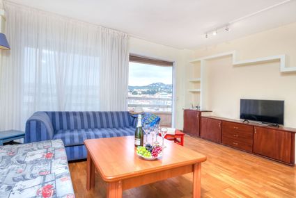 Bright, simple and practical furnishings: living/dining room with sliding door with 1 sofabed (135 cm, length 90 cm), satellite TV and air conditioning. Exit to the terrace. 1 room with 1 french bed (150 cm, length 190 cm). 1 room with 1 pull-out bed (2 pers. 2 x 90 cm, length 190 cm). Small kitchen (oven, microwave, freezer, electric coffee machine). Bath or shower/WC. HUTG017427
