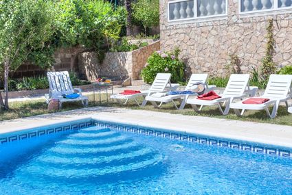 Aiguaviva Park: Single-family house "Cris". 9 km from the centre of Lloret de Mar, 9.5 km from the sea, located by a road. Private: property 1'000 m2, garden with lawn 45 m2, swimming pool (8 x 4 m, seasonal availability: 01.Jun. - 30.Sep.). Patio (170 m2), barbecue. In the house: washing machine. Stepped path (33 steps) to the house. Public parking on the road. Shop 7 km, supermarket 500 m, bus stop 200 m, sandy beach 7 km. Golf course 8 km. Please note: suitable for families. Groups of teenagers on request only. Neighbourhood highly sensitive to noise. Quietness and good behaviour expected. Petrol station and a road, 100 m. Restaurant in the shared grounds, 400 m.Availability