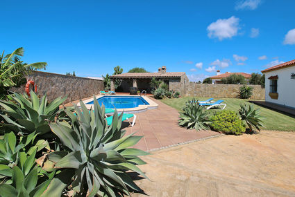 Bungalow "Cuatro Hermanos", surrounded by fields. In the district of Roche Viejo 4 km from the centre of Conil de la Frontera, 2 km from the sea, 2 km from the beach. Private: property 1'000 m2, garden with lawn and wildlife garden, swimming pool (8 x 4 m, depth 120 - 210 cm, 01.03.-31.10.). WC in the pool area, outdoor shower, patio, terrace, barbecue house, parking on the premises. Shop 4 km. Please note: car recommended. The owner does not accept any youth groups. Neighbourhood highly sensitive to noise. Quietness and good behaviour expected.Availability