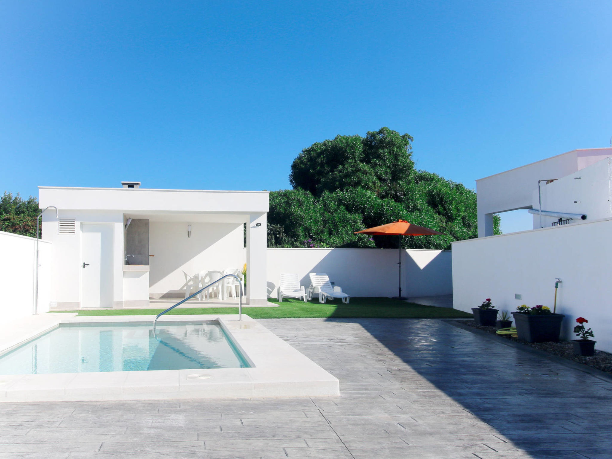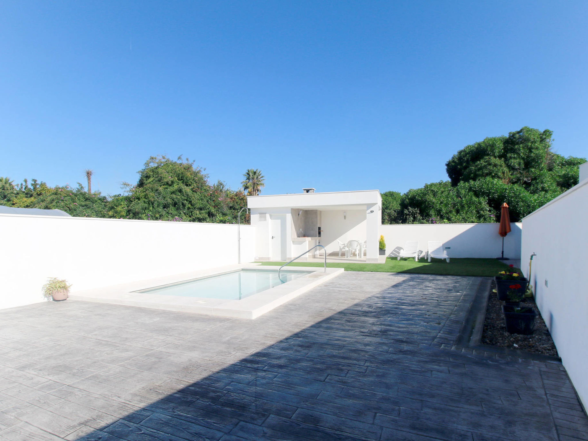 Modern bungalow "La Estancia", built in 2018. Barrio Nuevo 2 km from the centre of Conil de la Frontera, 49 km from the centre of Cádiz, 65 km from the centre of Jerez, in the residential district, 3 km from the sea, 3 km from the beach. Private: property 400 m2 (fenced), garden with lawn and wildlife garden, swimming pool (5 x 3 m, depth 115 - 145 cm, 01.01.-31.12.). Outdoor shower, terrace, garden furniture, barbecue house, parking on the premises. Shop 2 km. Please note: car recommended.Availability