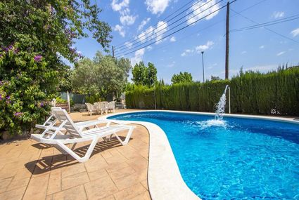 House "Villa Rosa". In the resort, 200 m from the centre, in a sunny position, 7 km from the sea. Private: property 1'400 m2, wildlife garden and trees, swimming pool kidney shaped (8 x 5 m, seasonal availability: 01.Jun.-30.Sep.). Outdoor shower, tennis, floodlit, garden furniture, barbecue. In the house: washing machine, tumble dryer. Parking (for 2 cars) on the premises, single garage space n 1. Supermarket 150 m, restaurant 80 m, bakery 200 m, bus stop 150 m, sandy beach "Sitges" 12 km, rocky beach "Vilanova" 7 km. Nearby attractions: Zona vitivinícola del Penedés St Sadurní, Port Aventura parque de atracciones 65 km, Aeropuerto de Barcelona 30 km, Monasterio de Montserrat. The owner does not accept any youth groups. Please note: the owner lives on the same property. The swimming pool has a kidney shape (approx. 25 m2) and has a cervical massage and is illuminated. There are 2 covered terraces (6 and 18 m2). Beside the barbecue there are awning, table and benches. Local access road to AP7 and C32 at 100 m. The owner lives on the ground floor.Availability