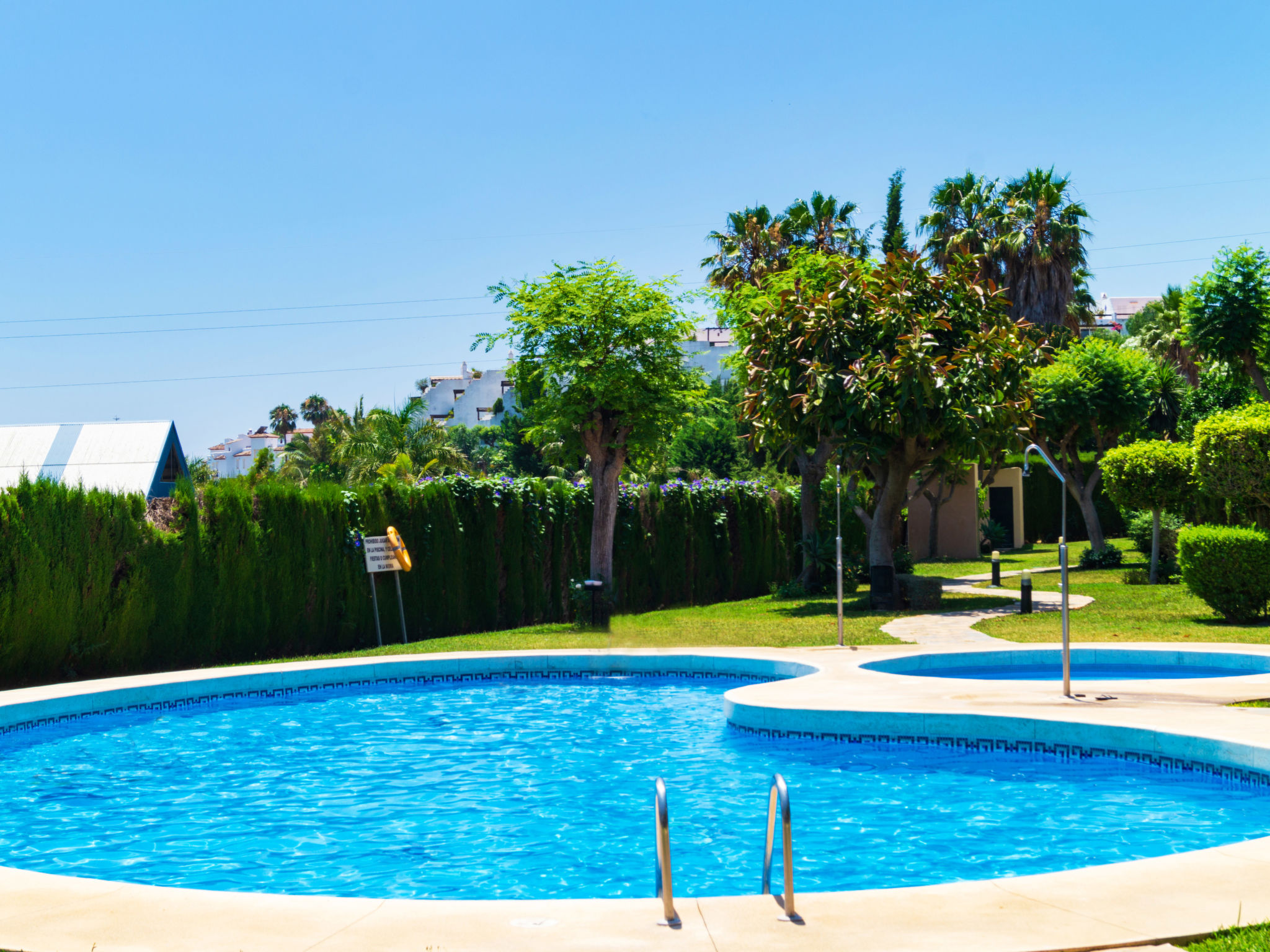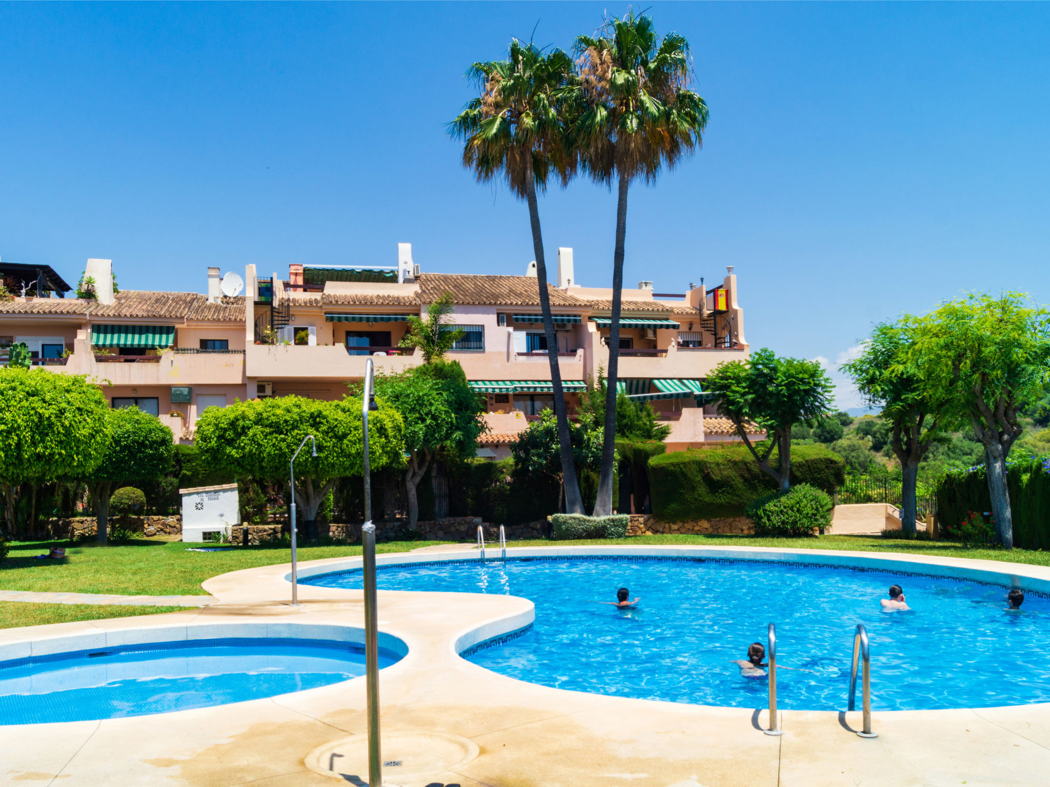 Beautiful, cosy apartment block "Terrazas de Bel Air". In the district of Bel Air 16 km from the centre of Marbella, 9 km from the centre of Puerto Banús, 10 km from the centre of Estepona, in a quiet, sunny position, 1.7 km from the sea, 1.7 km from the beach. For shared use: garden with lawn and flowers, 2 swimming pools (01.05.-30.09.). Outdoor shower, public parking on the road. Supermarket, restaurant 650 m, pebble beach 1.7 km. Golf course (18 hole) 500 m. Object suitable for 4 adults.Availability