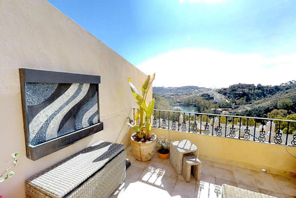 Going out through the big glass doors a lovely covered Ibiza styled terrace with high-end beach club vibe furniture's sets the perfect surroundings to enjoy a relaxed moment. On your left hand has a massive wooden dining table with white light dining chairs and above a beautifully detailed fan blows fresh air on you. On the other side of the terrace, there is a cosy lounge area with two sofas and a beautiful wooden sofa table. The whole terrace has window shutters that can be removed to an open space view gives you the most breathtaking view of the sea, mountains, golf courses and a lake. In the apartment, there is also an Internet-based music streaming service Yamaha Music Cast/Deezer in all rooms, which can be controlled from your phone and also an apple tv box.