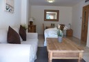 The living presents itself nicely with a dining table for 6 persons and a lounge with sofa and 1 arm chair. When passing the sofa area you enter the terrace of approximately 20 m2 through sliding doors with dining table for 6 people. The terrace is facing west and there is sunshine from midday until sunset.