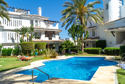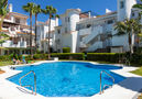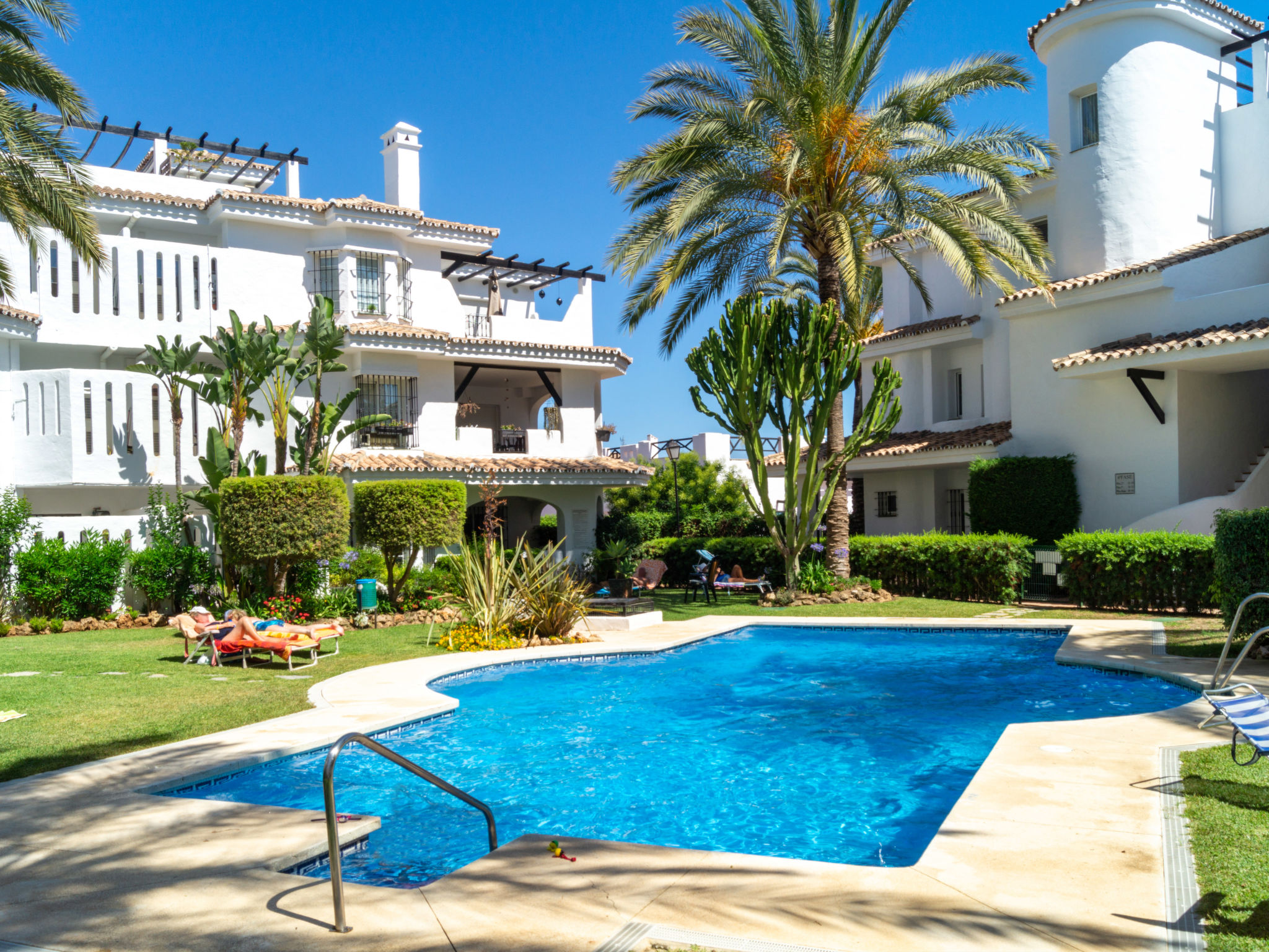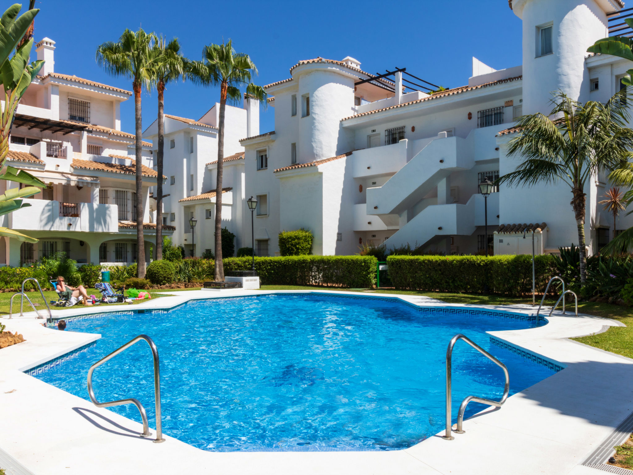 Nueva Andalucía: Beautiful, comfortable apartment block "Los Naranjos V". In the centre of Nueva Andalucía, in the resort 2 km from the centre of Puerto Banús, 5 km from the centre of Marbella, 2 km from the sea, east facing position. For shared use: park, garden with lawn, swimming pool (01.01.-31.12.). Outdoor shower. In the house: central heating system, air conditioning, washing machine. Parking at the house. Grocery, supermarket 100 m, restaurant 400 m, bakery, café 100 m, sandy beach 2 km. Golf course (18 hole), tennis 500 m. Object suitable for 5 adults. Please note: the complex has night security.Availability