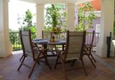 From the entrance gate you take a few steps down to a terrace area with sauna, outdoor shower and dining area for 8. Also there is an semi indoor fitness area with cross trainer.