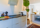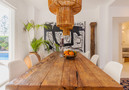 The living and kitchen space harmoniously blend in an open environment, showcasing a chic and cozy Scandinavian design infused with a touch of antiques and African art for a unique aesthetic. The interior exudes warmth and hospitality. Directly from the living area, you step out into the outdoor pool space and gardens, seamlessly connecting indoor and outdoor living. The kitchen is well-equipped. Additionally, a separated laundry room with a washing machine and tumble dryer, adds practical convenience to this home.