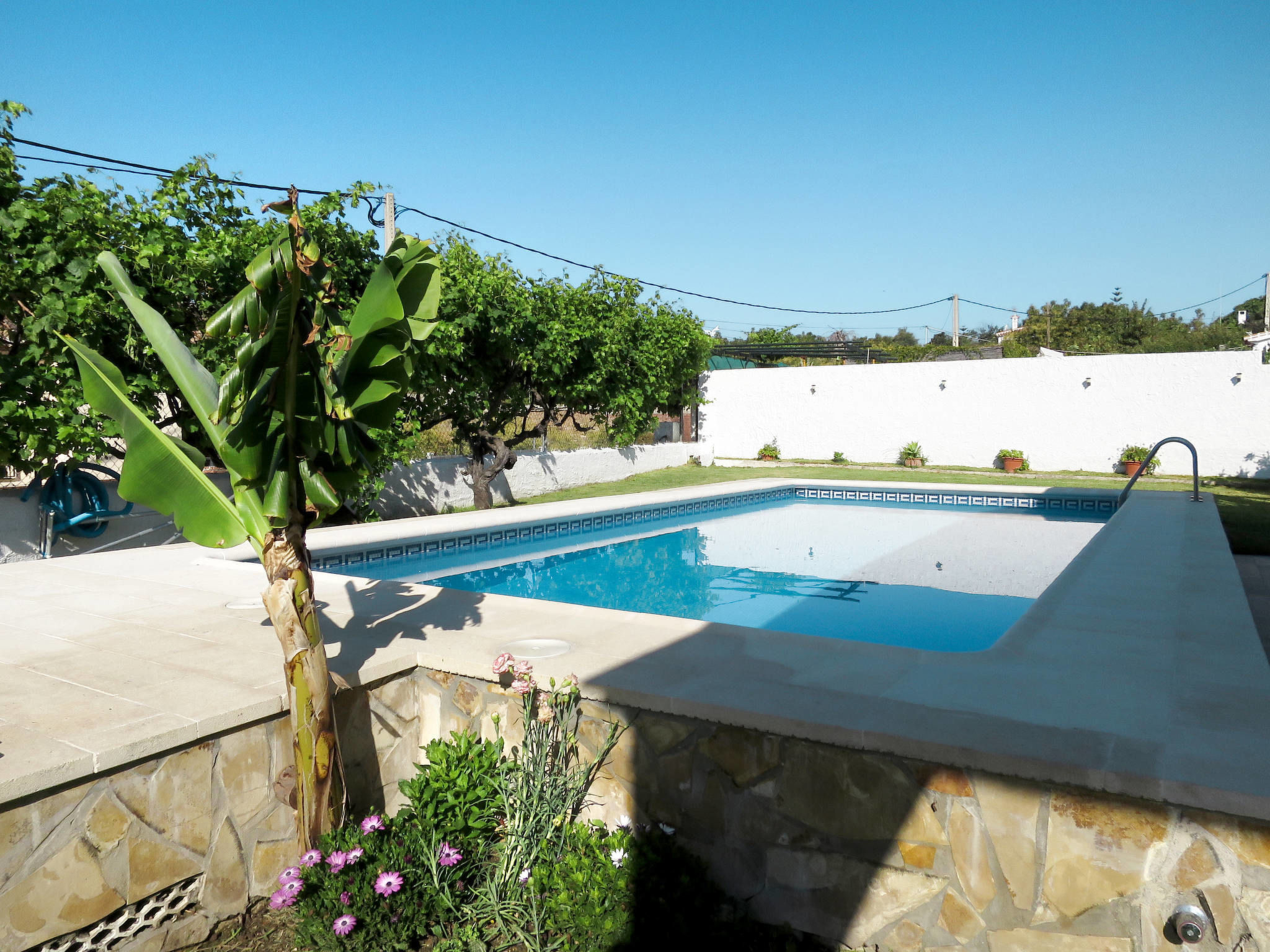 Beautiful, rustic single-family house "Corbera". In the district of La Exotica 2 km from the centre of Nerja, on the outskirts, 56 km from the centre of Málaga, 96 km from the centre of Granada, in the residential district, 3.5 km from the sea, 3.5 km from the beach. Private: property 850 m2 (fenced), garden with lawn and trees, orchard, swimming pool (9 x 4 m, depth 160 - 210 cm, seasonal availability: 01.Jan. - 31.Dec.). Outdoor shower. 150 m long bumpy motor access. Parking (for 4 cars) on the premises. Shop 500 m.Availability