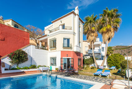 Torrox 1 km from Nerja: Stuning large villa situated in a quiet residential area but still only 15 minutes walk to nearest beach and restaurant. Less than 5 minutes drive to Nerja´s town centre. Property has three floors, one of them is situated in same level as pool/garden area and it is like a self contained apartment with independent access, kitchenet, showeroom, living area and double bed. An extra fold up bed can be placed in this area too. In total at the property there are 4 single beds and 2 double beds. Beautiful, comfortable house "Vista Bonita". In the resort 2 km from the centre of Nerja, in a sunny position residential area (villas), 500 m from the sea, 500 m from the beach. Private: garden, swimming pool angular (5 x 7 m, depth 100 - 180 cm, seasonal availability: 31.Dec.-01.Jan.). In the house: washing machine. Shop 2 km, grocery 2 km, supermarket 2 km, shopping centre 25 km, restaurant 500 m, bakery 4 km, café 500 m, pedestrian zone 2 km, pub garden 500 m, bus stop 1.5 km, railway station "Malaga" 50 km, sandy beach 500 m, diving center 2 km, thermal baths 2 km. Sports harbour 26 km, marina 26 km, golf course (18 hole) 20 km, surf school 20 km, tennis 2 km, sports centre 2 km. Nearby attractions: Nerja, Torrox, Frigiliana, La Herradura, Almuñecar, Competa. Well-known ski regions can easily be reached: Sierra Nevada. Hiking paths: Sierra Almijara, Sierra Tejeda, Las Alpujarras. Please note: car recommended. Baby equipment (included). The owner does not accept any youth groups. Loading and unloading of baggage is possible at the holiday house. Property ref. ES5405.127.1 is situated on the same property.Availability