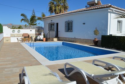Modern, beautiful, comfortable villa "Villa Cortijo el Olivar", built in 2000, renovated in 2016, surrounded by fields. House Equipment: air conditioning, washing machine (private use). Access & Parking: individual garage. All-season motor access to the house. Footpath 100 m. Situation: above Paseo Marítimo de Torrox Costa, quiet position in a residential area. View from the apartment of the sea, the mountains and the countryside. Surroundings of the house: grounds (private use, fenced), garden (private use, fenced), swimming pool (private use, length 9 m x width 5 m), outside shower (private use). Facilities and distances: shop 500 m, supermarket 400 m, restaurant 600 m, golf course 15 km, bus stop 500 m. Please note, nearby is a motorway in 2 km, main road in 600 m, railway line in 55 km and ein airport/airfield in 65 km.Availability