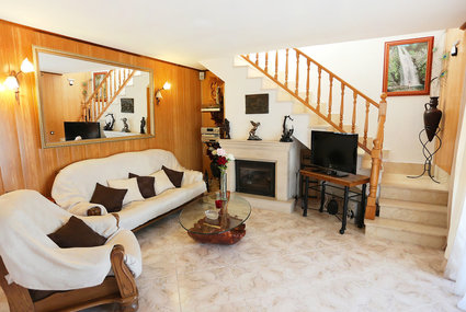Spacious, tasteful and cosy furnishings: large living/dining room with open-hearth fireplace, digital TV, CD-player, hi-fi system and DVD. Exit to the terrace, to the swimming pool. Large living/sleeping room with rooflight with 2 double sofabeds. Exit to the swimming pool. 1 room with 1 bed. Kitchen (oven, dishwasher, X ceramic glass hob hotplates, freezer) with dining table. Shower/WC. Air-conditioning. Upper floor: 1 double bedroom with 1 double bed (135 cm). 1 double bedroom with 1 double bed (150 cm). Exit to the terrace. Bath/bidet/WC. Air-conditioning. Patio. Terrace furniture, barbecue, deck chairs, covered balcony, sitting area. Facilities: washing machine, iron, baby cot, hair dryer. Internet (DSL/LAN, free). HUTT-001191