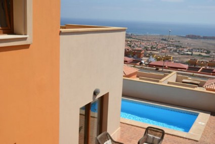 This villa complex is located in Caleta de Fuste, Fuerteventura. The villas (all with functional decoration) have good location on the island for the excursions to the north and south. The distribution of the villa is 2 floors with access from both levels. There are 2 bedrooms on the upper floor, one on the bottom and 3 bathrooms, 2 on the upper floor and another one on the ground floor. The master bedroom suite has double bed and adjacent bathroom with hot tub. The other 2 bathrooms are toilets (sink, WC and shower-cabin). Another bedroom has double bed and the third one which is located on the upper floor has 2 single beds. They also have patio on the ground floor, terrace and solarium on the upper floor. These villas will make your holiday some days of peace and comfort. You will enjoy a wonderful climate all the year round and practice sports such as windsurfing, surf, diving, skyte… Just 5 minutes driving from airport and less than 3km from the beach and 2 golf courses of 18 holes. The villas are notable for the fantastic views of the Atlantic Ocean from your private swimming pool.