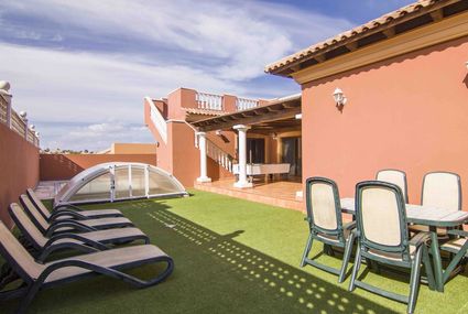 Beautiful, cosy, luxurious villa "Villa Rodrigo", built in 2007. House Equipment: billiard table, washing machine (private use). Access & Parking: private parking on the road. All-season motor access to the house. Suitable for wheelchairs. Situation: on the outskirts of Corralejo, in the district of vistas del mar, below Supermercado Mercadona, quiet, sunny position. View from the apartment of the sea, the resort and the countryside. Surroundings of the house: grounds (private use, 500 m2, fenced), park (shared use, 500 m2), garden (private use, 100 m2, fenced), swimming pool (private use, heated), indoor pool (private use, heated, length 6 m x width 3 m, open from 01.01. untill 31 .12.), outside shower (private use), barbecue (private use). Facilities and distances: shop 500 m, grocers 500 m, supermarket 500 m, restaurant 200 m, swimming pool 200 m, sandy beach 2 km, sports centre 3 km, golf course 1 km, tennis 2 km, riding stables 12 km, children's playground 500 m, m bus stop 300 m. Please note, nearby is a main road in 1 km and ein airport/airfield in 35 km. Ideal for families. Pool heating must be requested at least 1 week before the arrival date (extra fee: 10€ day/ to be paid on spot).Availability
