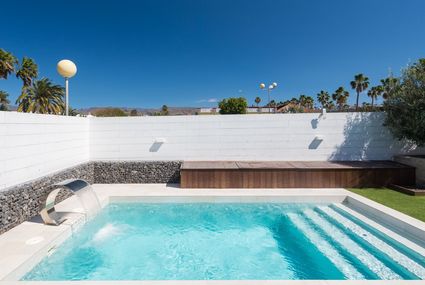 Large, modern villa "VILLA BLANCA". House Equipment: air conditioning, washing machine (private use), tumble dryer (private use). Access & Parking: parking by the house on the road. All-season motor access to the house. Situation: in the centre of MASPALOMAS, central, quiet position. Surroundings of the house: swimming pool (private use, length 3 m x width 6 m), outside shower (private use), barbecue (private use). Facilities and distances: shop 100 m, grocers 100 m, supermarket 100 m, restaurant 2 km, sandy beach 3.5 km, rocky beach 3.5 km, golf course 2 km, tennis 2 km. Please note, nearby is a motorway in 3 km and ein airport/airfield in 30 km.Availability