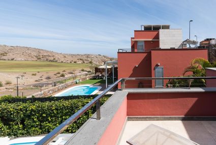 Large, modern villa "VILLA VISTA GOLF". House Equipment: air conditioning, washing machine (private use), tumble dryer (private use). Access & Parking: parking by the house. All-season motor access to the house. Situation: on the outskirts of MASPALOMAS, in the district of SALOBRE GOLF RESORT, above MASPALOMAS, quiet, sunny position. View from the apartment of the lake and the mountains. Surroundings of the house: garden (private use, 120 m2, fenced), swimming pool (private use, heated), children's playground (shared use), barbecue (private use). Facilities and distances: shop 500 m, grocers 500 m, supermarket 500 m, restaurant 500 m, shingle beach 8 km, sandy beach 8 km, rocky beach 8 km, golf course 100 m, children's playground 100 m, m. Please note, nearby is a motorway in 2 km, main road in 200 m and ein airport/airfield in 40 km.Availability