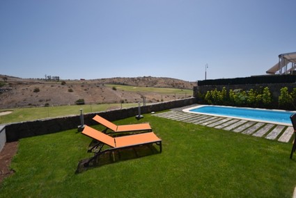 In the resort of Salobre Golf, is located this beautiful villa of recent construction, with private heated swimming pool and with magnificent and relaxing views over the golf course and the mountains. All bedrooms are provided with cold/warm air conditioning. Decorated tastefully, the exterior and interior furniture is of good design and first quality as well as the kitchen and the domestic appliances. Also a free wifi is included in the offer of this villa. There are 2 bedrooms, one with twin beds and with direct access to a terrace with sunbeds from where you can enjoy great views and the other bedroom with double beds and en suite bathroom at the ground floor with direct access to the porch and to the garden. A villa with lots of light, modern and cozy. Warm water and swimming pool are provided by thermal solar power. The villa is just 10 minutes away from the commercial area Meloneras and of Maspalomas´s beach, where you can find shops, cafeterias, ice cream shops, restaurants and all facilities for your deserved holidays.