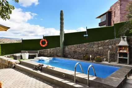 Large, modern villa "Las Terrazas 17 Villa with Pool". House Equipment: air conditioning, solarium, washing machine (private use). Access & Parking: private parking. All-season motor access to the house. Car recommended. Situation: in the centre of Salobre Golf Resort, above Maspalomas 7km, quiet, elevated, sunny position on top of a hill. View from the apartment of the mountains. Surroundings of the house: grounds (private use, fenced), garden (private use), lawn (private use), swimming pool (private use, length 5 m x width 3 m), barbecue (private use). Facilities and distances: grocers 800 m, supermarket 2.5 km, restaurant 100 m, sandy beach 8 km, golf course 50 m. Swimming pool heating: extra (20€/night, to be requested in the reservation and to be paid on spot).Availability