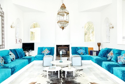 Moroccan living room with fireplace and international satellite TV, Hi-Fi