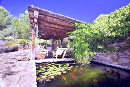 Across from the house is a covered terrace with chill out next to a koi pond. Several sofas,
