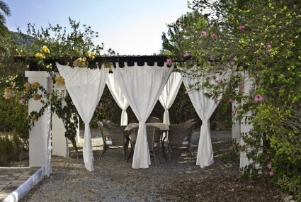 On the outside, in front of the house there is a covered dining area and curtained porch.