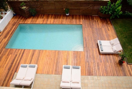 Pool of 8m x4 m, with maximum depth of 1.50 m and surrounded by a wooden terrace.