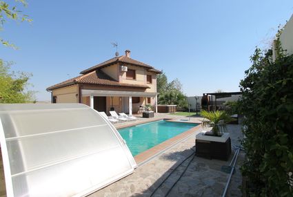 Large, beautiful, cosy chalet "CASA JARDIN", surrounded by fields. House Equipment: central heating system, air conditioning, solarium, sauna (private use), washing machine (private use), tumble dryer (private use). Access & Parking: parking by the house on the road. All-season motor access to the house. Car recommended. Situation: on the outskirts of SESEÑA, above Seseña, sunny position in the countryside. View from the apartment of the valley, the forest and the river. Surroundings of the house: garden (private use, 500 m2), swimming pool (private use, length 9 m x width 4 m, open from 01.06. untill 30 .09.), indoor pool (private use, length 9 m x width 4 m, open from 01.05. untill 30 .10.), outside shower (private use), table tennis (private use), barbecue (private use). Facilities and distances: shop 1 km, grocers 1 km, supermarket 1 km, restaurant 1 km, indoor swimming pool 1 m, sports centre 5 km, golf course 12 km, tennis 5 km, tennis club 4 km, riding stables 5 km, ice rink 8 km, children's playground 2 km, m bus stop 300 m. Please note, nearby is a motorway in 3 km, main road in 1 m, railway line in 4 km and ein airport/airfield in 46 km. MANDATORY request prior authorization from the owner to hold any kind of event (extra charge).Availability
