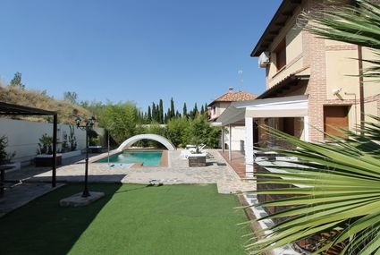 Large, beautiful, cosy chalet "CASA JARDIN", surrounded by fields. House Equipment: central heating system, air conditioning, solarium, sauna (private use), washing machine (private use), tumble dryer (private use). Access & Parking: parking by the house on the road. All-season motor access to the house. Car recommended. Situation: on the outskirts of SESEÑA, above Seseña, sunny position in the countryside. View from the apartment of the valley, the forest and the river. Surroundings of the house: garden (private use, 500 m2), swimming pool (private use, length 9 m x width 4 m, open from 01.06. untill 30 .09.), indoor pool (private use, length 9 m x width 4 m, open from 01.05. untill 30 .10.), outside shower (private use), table tennis (private use), barbecue (private use). Facilities and distances: shop 1 km, grocers 1 km, supermarket 1 km, restaurant 1 km, indoor swimming pool 1 m, sports centre 5 km, golf course 12 km, tennis 5 km, tennis club 4 km, riding stables 5 km, ice rink 8 km, children's playground 2 km, m bus stop 300 m. Please note, nearby is a motorway in 3 km, main road in 1 m, railway line in 4 km and ein airport/airfield in 46 km. MANDATORY request prior authorization from the owner to hold any kind of event (extra charge).