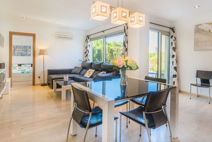 Bonaire 3 km from Alcúdia: Very modern, comfortable villa "Bon Estar", 2 storeys. In a quiet, sunny position residential area (villas), 2 km from the edge of the forest, 1.3 km from the sea, 2.5 km from the beach. Private: well-kept garden with wildlife garden, swimming pool (01.01.-31.12.). Patio, pergola, garden furniture, barbecue. In the house: WiFi, air conditioning, washing machine. Shop 3.5 km, supermarket 3.5 km, restaurant 1 km, bar 1 km, bakery 3.5 km, bicycle rental 3 km, pub garden 1 km, 40 minute walk to the centre, bus stop 3 km, sandy beach 2.7 km, rocky beach 1.8 km. Sports harbour 1.5 km, golf course (18 hole) 8 km, tennis 3.2 km, riding stable 4 km, walking paths from the house 1 km. Please note: suitable for families, suitable for seniors. Object suitable for 8 adults groups of teenagers on request only. Loading and unloading of baggage is possible at the holiday house. Airfield 64 km from the property.Availability