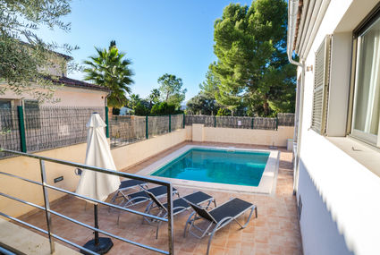 Bonaire 2 km from Alcúdia: Very modern, cosy villa "Villa Malpas", 2 storeys. In the district of Bonaire, 500 m from the edge of the forest, 1.2 km from the sea. Private: garden with wildlife garden, swimming pool angular, heated (6 x 4 m, 01.01.-31.12.). Outdoor shower, patio, arbour, pergola, garden furniture, barbecue. In the house: WiFi, storage room for bicycles, air conditioning, washing machine. Parking at the house on the premises. Shop 2 km, supermarket 3 km, restaurant 1 km, bar 1 km, sandy beach 1.2 km, rocky beach 900 m. Sports harbour 900 m, golf course (18 hole) 5 km. Please note: suitable for families, suitable for seniors. Object suitable for 8 adults. Loading and unloading of baggage is possible at the holiday house.Availability