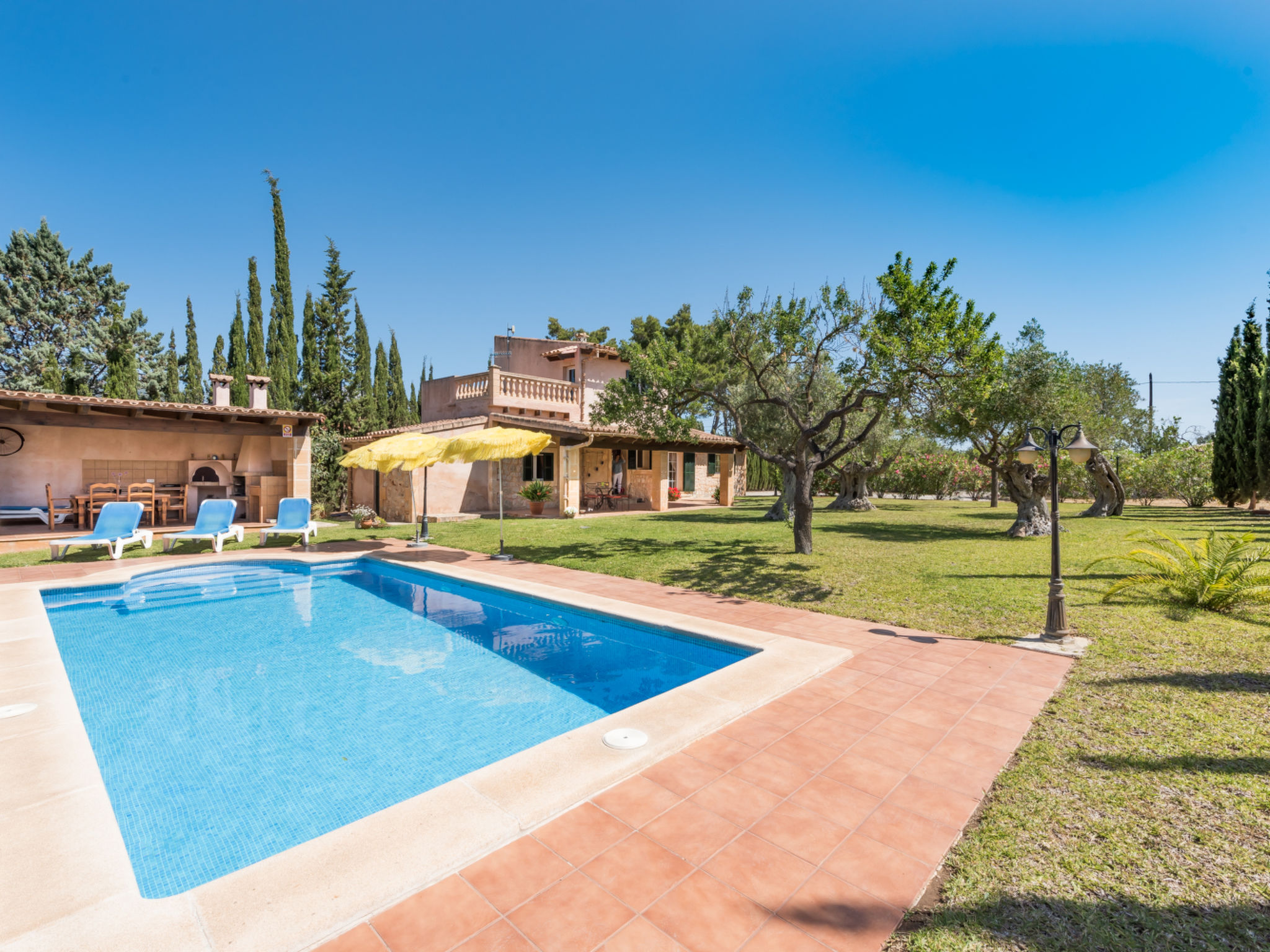 Biniamar: Very beautiful, rustic farm estate "Son Batle", 2 storeys, renovated, surrounded by trees and fields. Outside the resort, 1 m from the centre of Biniamar, in a quiet, sunny position, 1 km from the edge of the forest, 29 km from the sea, 29 km from the beach, in the countryside. Private: large garden with lawn and trees, swimming pool angular (7 x 3 m, 01.01.-31.12.). Outdoor shower, patio, pergola, garden furniture, barbecue, barbecue house. In the house: internet access, WiFi, storage room for bicycles, air conditioning, washing machine. Parking at the house. Shop 1 km, grocery 1 km, supermarket 1 km, restaurant 1 km, bar 1 km, bakery 1 km, internet café 1 km, pedestrian zone 1 km, bicycle rental 2 km, pub garden 1 km, 10 minute walk to the centre, bus stop 1 km, railway station 1.2 km, sandy beach 29 km, rocky beach 29 km. Sports harbour 30 km, marina 30 km, golf course (18 hole) 30 km. Please note: car recommended. Suitable for families, suitable for seniors. Object suitable for 5 adults groups of teenagers on request only. Loading and unloading of baggage is possible at the holiday house. Animals in the neighbourhood. Airfield 45 km from the property.Availability