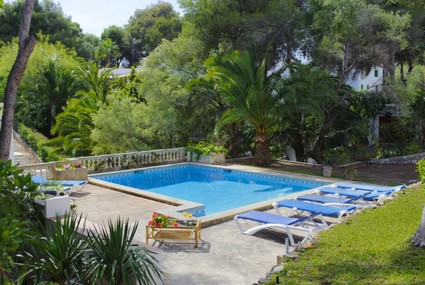 At the back of the villa there is a covered terrace overlooking the pool area with a sitting area to relax, a teak table, chairs and a portable barbecue to enjoy “al fresco” meals. There is a rectangular pool with Roman steps (8m x 6m. – Deph Min.0.80, Max 2.00m.) and a sun terrace with sun beds. The Mediterranean garden around the pool has tall palm and pine trees that provide a nice shade for the warmest days of the summer. From the garden there is access to the back street and only 50m. away we find the sandy cove “Cala D’Or”.