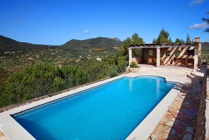 Perched on the top of a hillside commanding truly magnificent views across verdant valleys cloaked with a patchwork of olive and citrus groves to the distant sea and Mallorcan coastline. Ses Matas Clares affords a totally quiet and private location with some of the finest possible views. The private country lane winds up to the top of the hill and you have arrived for your memorable holiday.Accommodation From the front covered porch, the oak studded door opens into the impressive hallway and further into the attractive dining room with a teak dining suite. An inner stone arch leads into the spacious lounge with comfy sofas, Playstation 3 with one handset, Satellite TV, DVD player and twin french doors opening to the garden terraces. Fully fitted kitchen has breakfast table, local handmade teak cupboards, dishwasher, microwave, fridge/freezer, electric oven - gas hob, coffee maker, kettle and toaster. The master twin bedroom has ensuite bathroom with a corner bath and direct access to the ballastrad lined sun terrace. One double bedroom and one twin bedroom with a doorway to the terrace, share one full bath/shower room.