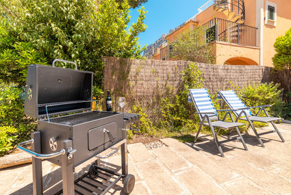Object suitable for 6 adults. Spacious and bright, very practical and comfortable furnishings: open large living/dining room with panoramic window with open-hearth fireplace, dining table, TV, flat screen, air conditioning and forced-air heating. Exit to the patio. Open kitchen (oven, dishwasher, 3 ceramic glass hob hotplates, toaster, kettle, microwave, freezer, electric coffee machine). Exit to the patio. Bath/shower/WC. Upper floor: 1 large double bedroom with panoramic window with 1 french bed, bath/bidet/WC, air conditioning and forced-air heating. Exit to the terrace. 2 large double bedrooms with panoramic window, each room with 2 beds (90 cm). Bath/shower/WC. Large balcony, patio 45 m2. Terrace furniture, balcony furniture, barbecue, covered balcony. Very beautiful view of the sea, the countryside, the resort and the bay. Facilities: washing machine, hair dryer. Internet (WiFi, free). Suitable for families. 1 pet/ dog allowed. ETV6789