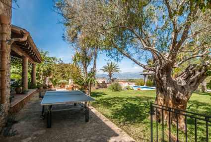 Costitx: Very large, beautiful farm estate "Can Tomeu", 2 storeys, surrounded by meadows. Outside the resort, in a quiet, sunny, elevated position, 1 km from the edge of the forest, 28 km from the sea, 28 km from the beach, in the countryside. Private: large garden with lawn and wildlife garden, pond, swimming pool angular (8 x 4 m, seasonal availability: 01.Apr.-24.Nov.). Shower/WC in the pool area, hot tub, patio, pergola, garden furniture, barbecue. In the house: internet access, WiFi, fitness room, central heating system, air conditioning, washing machine, tumble dryer. Steep motor access. Parking at the house. Grocery 1.3 km, supermarket 1.3 km, restaurant 1.3 km, bar 1.3 km, pub garden 1.3 km, 8 minute walk to the centre, sandy beach 28 km, rocky beach 28 km. Sports harbour 29 km, golf course (18 hole) 28 km. Please note: car recommended. Suitable for families, suitable for seniors. Object suitable for 8 adults groups of teenagers on request only. Animals in the neighbourhood. Airfield 40 km from the property.