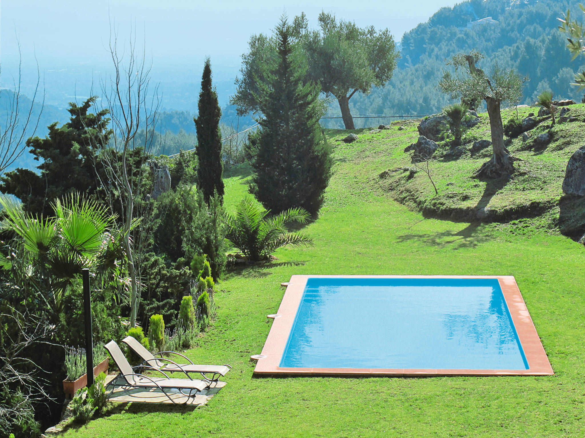Situation: rural, panoramic view. Access/parking: parking on the estate. Access to the house via stairs (5 steps). Estate (private use): approx. 6000 m², partially self-contained, in a hillside, with plants, lawn, olive trees, palm trees. Outdoor facilities(private use): terrace 90 m², further terrace 15 m², further terrace (roofed), furnishing provided. Pool (private use): 10.0 x 5.0 m, open throughout the entire season. Pool area: lawn, sun loungers, external shower. Please note: distance to the pool approx. 20 m. ● Distances: Center Esporles in approx. 4.5 km Valldemossa in approx. 18 km Palma in approx. 22 km, Next shopping possibility in approx. 4.5 km, Airport Palma in approx. 27 km, Sea in approx. 13 km Sandy beach in approx. 28 km (Playa de Palma) Pebble beach in approx. 13 km (Port de's Canonge ).Availability