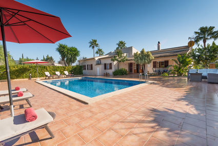 2 km from Inca: Very large, cosy, comfortable farm estate "El Roser", renovated, surrounded by trees. Outside the resort, 2 km from the centre of Inca, in a quiet, sunny position residential area (villas), 4 km from the edge of the forest, 28 km from the sea, 28 km from the beach, in the countryside. Private: large garden with trees, swimming pool angular (10 x 6 m, 01.01.-31.12.). Table tennis, patio, pergola, garden furniture, barbecue. In the house: internet access, WiFi, central heating system, air conditioning, washing machine. Roofed, parking at the house on the premises. Shop 2 km, grocery 2 km, supermarket 2 km, shopping centre 30 km, restaurant 2 km, bar 2 km, bakery 2 km, café 2 km, internet café 2 km, pedestrian zone 2 km, pub garden 2 km, 45 minute walk to the centre, bus stop 2 km, railway station 3 km, sandy beach 29 km, rocky beach 29 km. Sports harbour 29 km, marina 29 km, golf course (18 hole) 25 km. Please note: car recommended. Suitable for families, suitable for seniors. Object suitable for 8 adults groups of teenagers on request only. Loading and unloading of baggage is possible at the holiday house. Animals in the neighbourhood.Availability