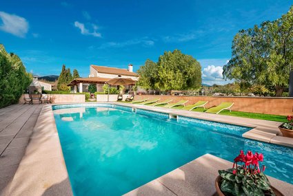Lloseta 2 km from Inca: Very beautiful, cosy, rustic farm estate "Casa Ana", surrounded by trees. Outside the resort, in a sunny position. Private: property (fenced), beautiful garden to relax, swimming pool angular (9 x 4 m, 01.05. and 31.10.). Shower/WC in the pool area, outdoor shower, patio, pergola, garden furniture, barbecue. In the house: internet access, WiFi, air conditioning, washing machine. Parking at the house on the premises. Shop 2 km, supermarket 2 km, shopping centre 2 km, restaurant 2 km, bakery 1.5 km, pub garden 1.7 km, railway station "Inca" 2 km, sandy beach "Alcudia" 25 km. Nearby attractions: Restaurante Santi Taura 1.2 km, Restaurante Tomeu Lassio 1.7 km, Restaurante Can Carrossa. Hiking paths: Tossals Verds 12 km, Biniamar 3 km. Please note: car recommended. Suitable for families, suitable for seniors baby equipment (included). Object suitable for 7 adults groups of teenagers on request only. Loading and unloading of baggage is possible at the holiday house.Availability