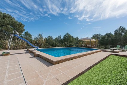 11 km from Llucmajor: Large, comfortable house "Ses Tanques", 2 storeys, surrounded by trees and fields. Outside the resort, 12 km from the centre of Llucmajor, in a secluded, quiet, sunny position, 9.5 km from the sea, 12 km from the beach, in the woods. Private: natural state property 14'000 m2, large garden with lawn and trees, orchard, swimming pool fenced (10 x 5 m, depth 115 - 220 cm, 01.04. and 31.10.). Slide, outdoor shower, patio, pergola, garden furniture, barbecue. In the house: internet access, WiFi, air conditioning, washing machine, tumble dryer. Available: children's bicycles. 1.5 km long bumpy motor access. Roofed, parking (for 2 cars) at the house on the premises. Shop 6 km, supermarket 8 km, restaurant 8 km, bus stop 11 km, sandy beach "Arenal" 12 km, rocky beach "Cala Blava" 9.5 km. Golf course (18 hole) 6 km. Nearby attractions: Ruta ciclista, Maioris golf (18 hoyos) 6 km, Son Antem golf (2 x 18 hoyos) 6 km, Playa Sa Rapita 16 km, Bosque de pinos en el terreno. Please note: car recommended. Suitable for families, suitable for seniors. Object suitable for 8 adults. Loading and unloading of baggage is possible at the holiday house. Airfield 29 km from the property.