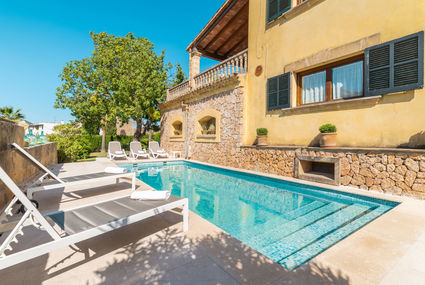 Very large, beautiful, cosy house "Son Apiana", 2 storeys. In the centre of Mancor de la Vall, in a quiet, sunny position, 500 m from the edge of the forest, 30 km from the sea. Private: large garden (fenced) with lawn and wildlife garden, swimming pool angular (8 x 4 m, seasonal availability: 01.Jan.-31.Dec.). Outdoor shower, patio, arbour, pergola, garden furniture, barbecue. In the house: internet access, WiFi, central heating system, air conditioning, washing machine. Parking at the house on the premises. Grocery 200 m, supermarket 300 m, shopping centre 20 km, restaurant 350 m, bar 250 m, bakery 200 m, pub garden 250 m, 2 minute walk to the centre, bus stop 500 m, railway station "Inca" 5 km, ferry "Alcúdia" 29 km, sandy beach "Port d'Alcúdia" 29 km, rocky beach "Alcúdia" 30 km. Sports harbour 29.5 km, marina 29.5 km, golf course (18 hole) 29 km, surf school 28.5 km, tennis 400 m, riding stable 4 km, walking paths from the house, cycle lane 500 m, children's playground 400 m. Nearby attractions: Santuario de Lluc, Escorca. 15 km, Pueblos: Selva,Caimari,Moscari,Biniamar 5 km, Festival Park(shopping center, cinemas). 25 km, Restaurant Sa Piscina. (Mancor). 450 m, Restaurant María Salinas (Mancor). 250 m. Hiking paths: Serra de Tramuntana, Puig de Massanella. Monasterio de Santa Llucía - Biniarroi. Please note: suitable for families, suitable for seniors. Object suitable for 8 adults groups of teenagers on request only. Airfield 43 km from the property.Availability