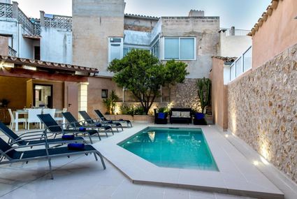 Comfortable terraced house "Horta 55", renovated in 2017. House Equipment: air conditioning, washing machine (private use). Access & Parking: on the road. All-season motor access to the house. Situation: in the centre of Pollença, central position. View from the apartment of the resort. Surroundings of the house: grounds (private use), swimming pool (private use). Facilities and distances: shop 20 m, grocers 20 m, supermarket 20 m, restaurant 10 m, sandy beach 6 km.Availability