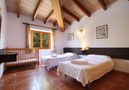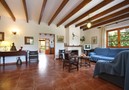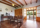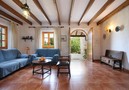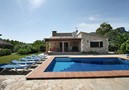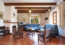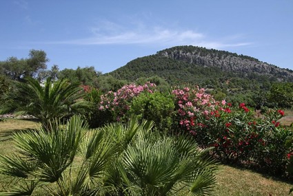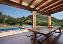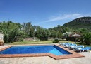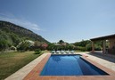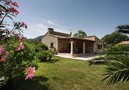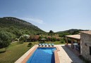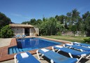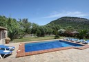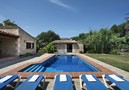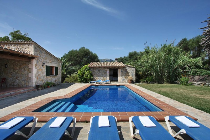 This single storey villa provides an ideal holiday home in a rural location not far from the old town of Pollensa while the beaches in Port Pollensa and Cala San Vicente are within a few minutes drive. Approaching from the front covered terrace, the large oak studded door opens directly into the spacious living toom with two sofas and satellite TV plus a DVD player. A large fitted rustic style kitchen with dishwasher, microwave, electric oven, gas hob and a fridge/freezer has direct access to the rear terrace with views to the roman stepped swimming pool and gardens. There is also a small built in barbecue area with a shower room and a washing machine. The bedrooms are to the left of the living room, they comprise of one master bedroom and three twins, all sharing two full bathrooms and all completes with fitted wardrobes. There is also air conditioning in all the bedrooms. The comfortable furnishings complement the classic décor and the local style design and it is combined with terracotta tiles and oak beamed ceilings throughout. The mozaic swimming pool with roman steps surrounded by lawn and a covered terrace with a wooden dining table and benches has stunning views onto the Puig de Maria hill. Completes the exterior of the villa a built in barbecue and a shower room. Villa Caragola is a stone clad house with plenty of spaces for a family holiday.