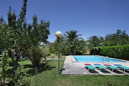 Deeper into the countryside we arrive at the Villa El Clos. This lovely cottage is situated outside the old town of Pollensa in a very pretty area known as the Colonya Valley just a 10 minutes drive to the historic town of Pollensa. It is a relaxing villa with lovely mountain views and a nice garden. Inside, the design is totally traditional with some modern touches, terracotta tiles, wooden floors and also wooden beamed ceiling. The large front covered terrace leads into the lounge dining and open kitchen. This is totally equipped with electric oven, gas hob, microwave and a fridge freezer. The lounge has sofas and it is equipped with satellite TV and a DVD player. Wooden stairs lead up to a mezzanine bedroom with two single beds, ideal for older children or couples. A corridor gives access to the rest of the bedrooms, one twin and one double which both have sloping roofs that gives the house a cosy atmosphere. Both bedrooms have wardrobes and wooden floors. A full bathroom completes the villa. The gardens and pool are very well presented, surrounded by palm, lemon and fig trees plus many other small plants and flowers such as cacti and roses. There are mountain views on the distance. Next to the shady terrace there is a lovely built in barbecue with plenty of working areas and an old bread wood oven.