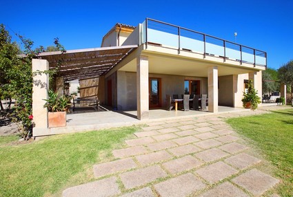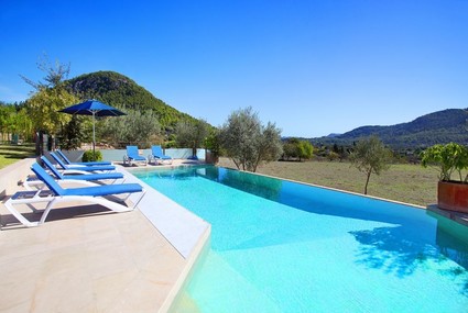 From the minute you open the front doors you will enjoy the opulence and originality this property with complimentary air conditioning in all bedrooms, living room and kitchen for 24 hours per day Stone arched entrance and double wooden doors lead into the spacious hallway. Straight ahead a door and one step down lead into a vast kitchen which is a culinary artist’s delight as it boasts a chef’s station, sophisticated electric oven and six ring gas hob. The kitchen is very light and airy, granite marble effect worktops and stylish cupboards along with glass table and chairs giving an "ultra modern" look. There are two full sized fridge/freezers, dishwasher and microwave. To the rear of the kitchen a door either side gives a choice of stepping out on the side BBQ terrace or the rear covered terrace with large wooden dining table and raffia chairs. There are stunning views of the Puig de Maria and across the surrounding countryside. Just off the kitchen area we find a spacious "walk in" pantry and a utility area with washing machine. Two large glass doors open on to the rear BBQ terrace. To the right of the kitchen floor to ceiling glass doors open into the comfortable lounge/dining area. This theme continues as triple sets of glass sliding doors open out onto two different terraces. A further set of sliding glass doors open back into the entrance hall. There is complimentary Wifi internet, Satellite TV, DVD player and PlayStation 2. To the right of the entrance hallway we find a twin bedroom with en-suite bathroom. The bedroom has marble flooring and the bathroom pretty beige toiling and an enormous mirror. Downstairs there is also a shower room with walk in shower W.C. and hand basin. To the left of the front door the impressive staircase leads us up to the rest of the sleeping accommodation. All the bedrooms have vast built in wardrobes, high wooden beamed ceilings making them light and airy, parquet flooring and en-suite bathrooms with pretty beige floor tiles. At the top of the stairs is a comfy seating area with T.V. and satellite, an ideal spot for relaxing or enjoying a siesta away from the midday sun. Just off this seating area we find a second shower room with walk in shower W.C. and hand basin. To the left of the stairs there is a double bedroom with en-suite bathroom and boasting access to a shared. The next bedroom along is the master double with en-suite bathroom with Jacuzzi style corner bath and walk in shower. Double doors open out onto a shared terrace. The third bedroom is a twin with en-suite bathroom and side door opening onto a smaller private terrace.