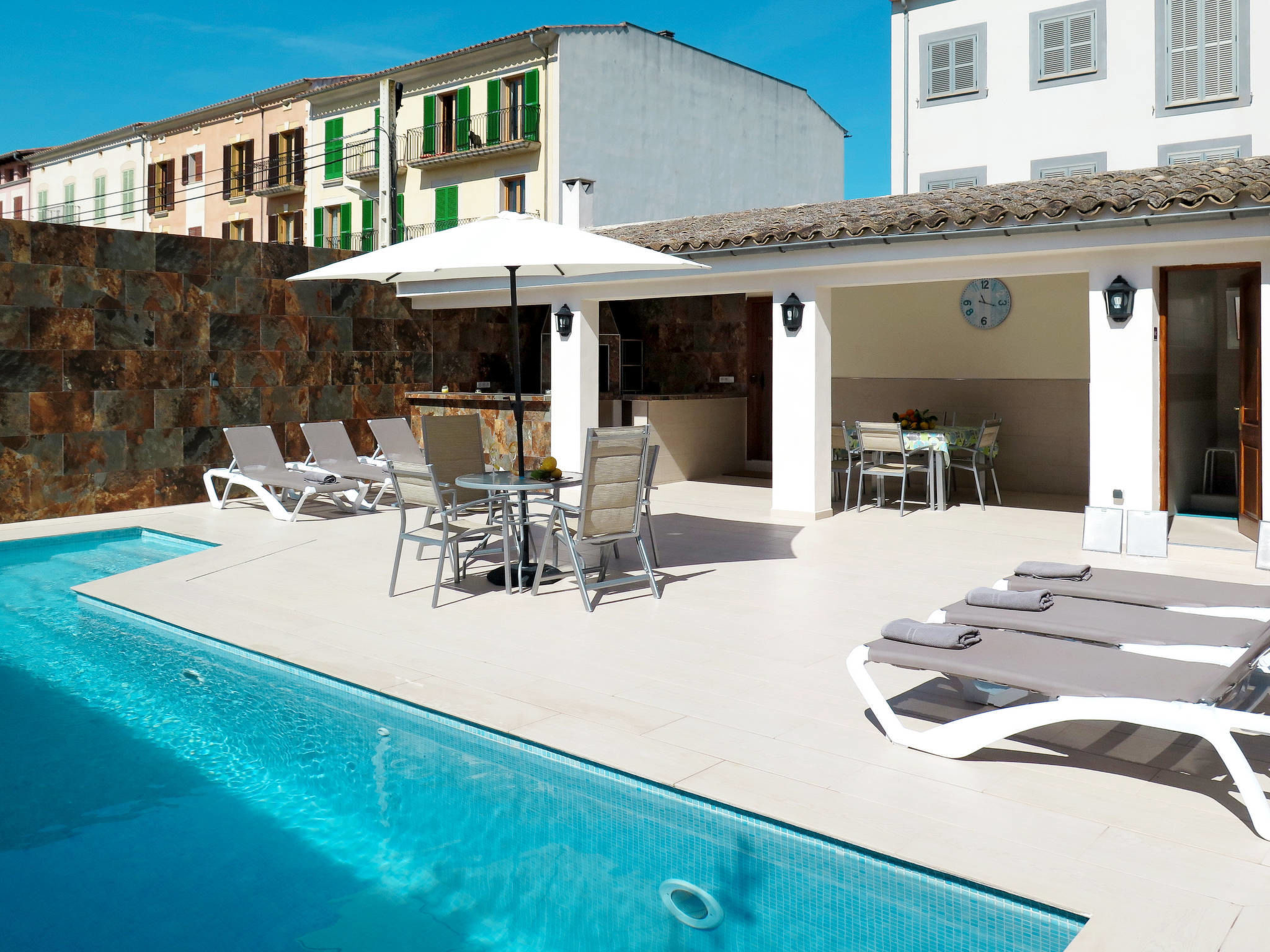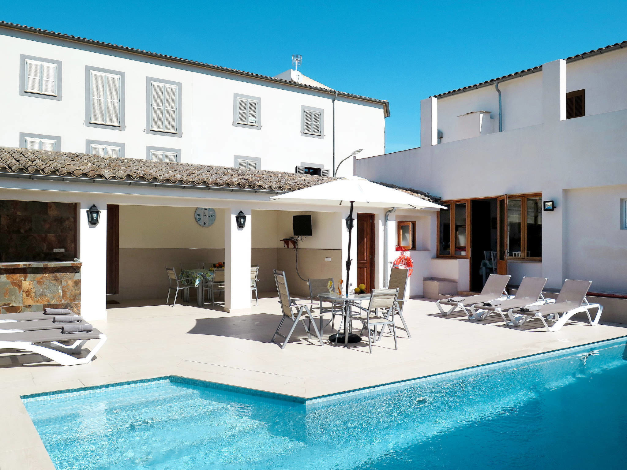 Feature: Please note: Non-smoking house. The upper floor will be closed. Situation: suburbian area Porreres. Access/parking: parking on the road near the house. Estate (private use): approx. 250 m², closed plot (wall), flagged floor. Outdoor facilities(private use): terrace 90 m², further terrace 25 m² (roofed), furnishing provided, brick barbecue. Pool (private use): 9.0 x 4.0 m, open throughout the entire season. Pool area: tiled, 6 sun loungers, sunshade. ● Distances: Center Porreres in approx. 600 m. Felanitx in approx. 14 km. Inca in approx. 32 km. Next supermarket in approx. 350 m. Airport Palma in approx. 35 km.Availability