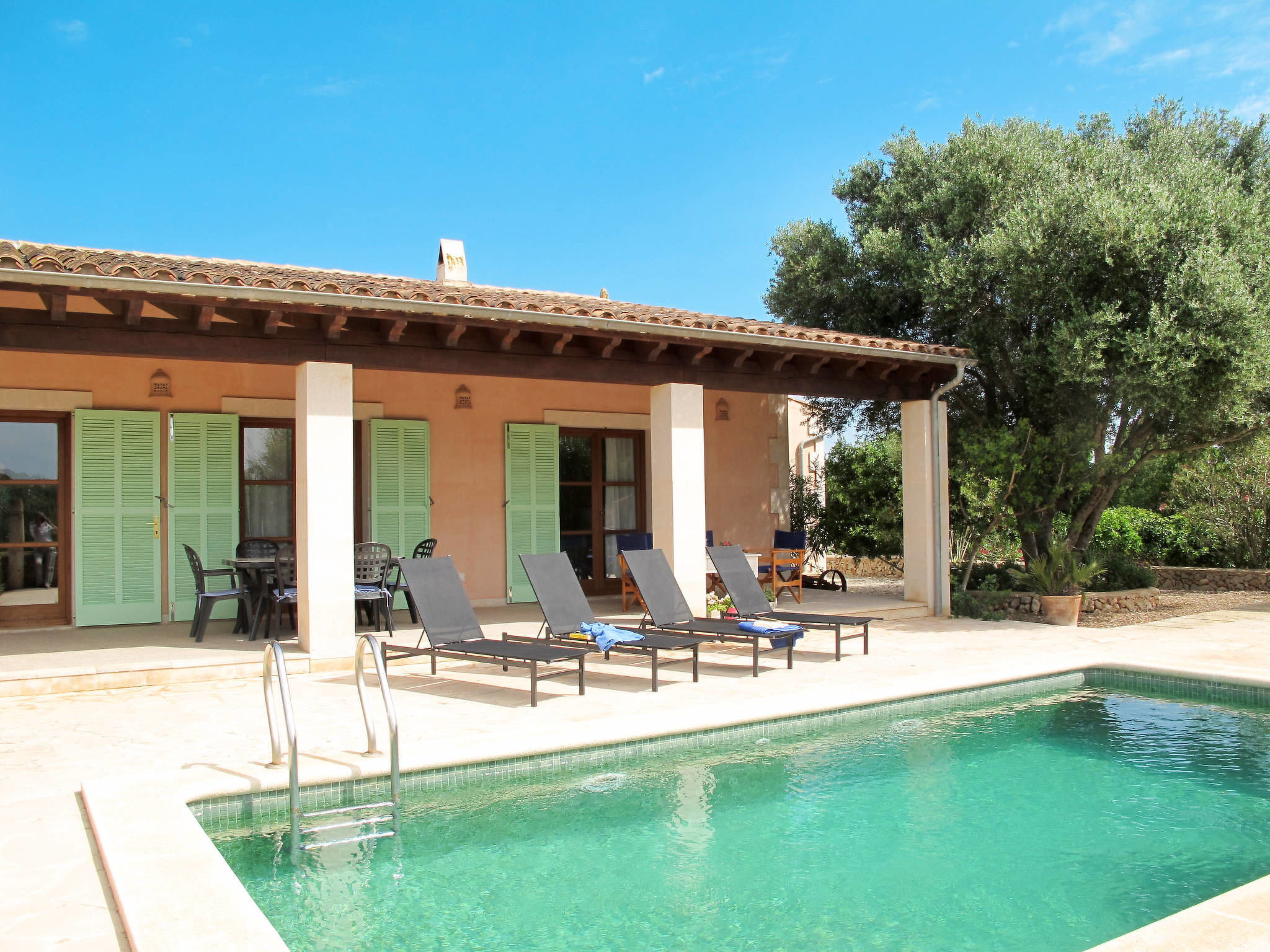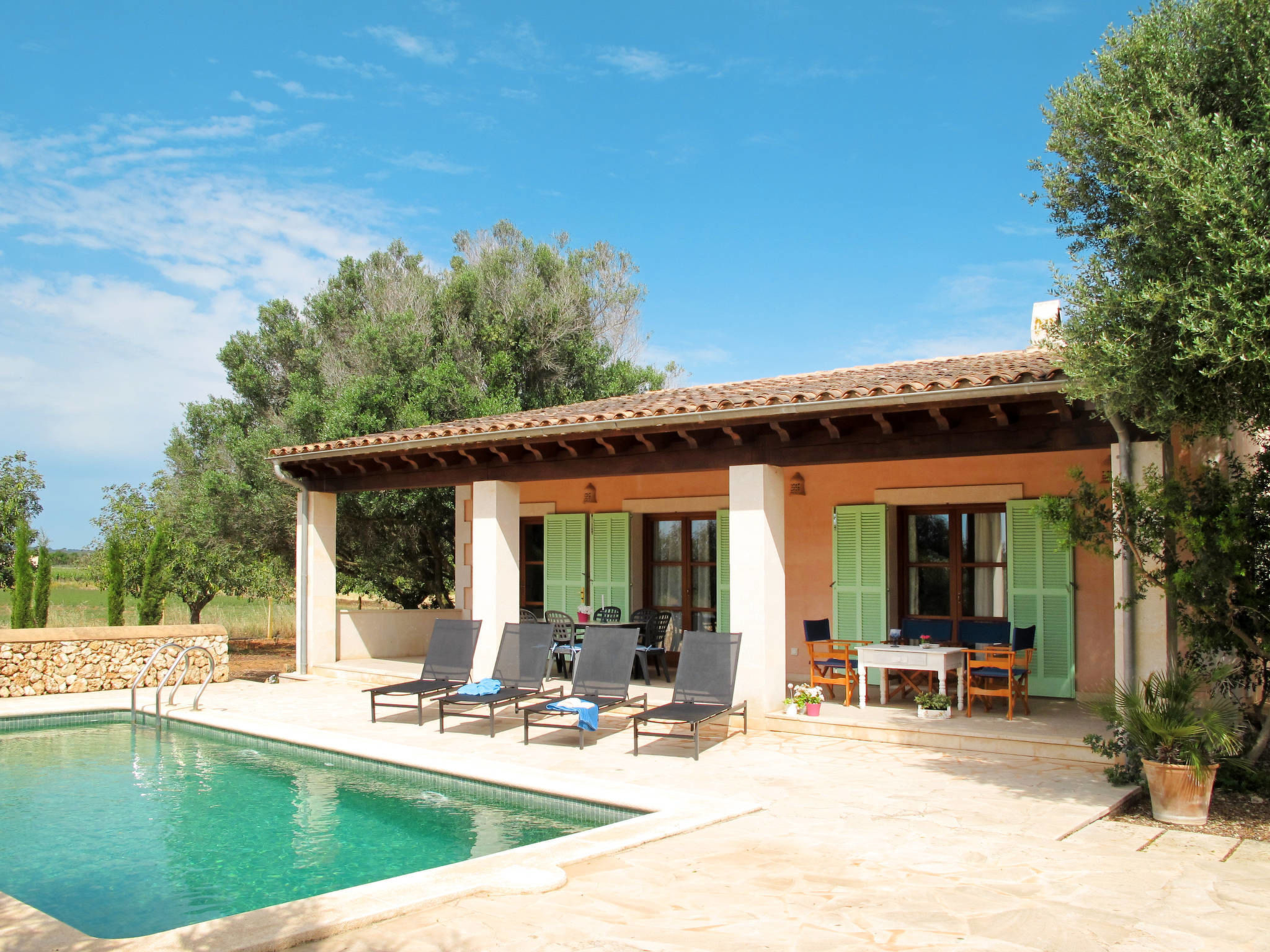 Farm estate "Son Pau", detached, surrounded by fields. 3.6 km from the centre of Porreres, 8 km from the centre of Campos, 46 km from the centre of Palma, 20 km from the sea. Private: property 7'000 m2 (fenced) with trees, orchard, swimming pool (7 x 4 m, 01.01.-31.12.). Outdoor shower, parking on the premises. Shop 3.5 km, supermarket 8 km, sandy beach "Es Trenc" 20 km. Please note: car recommended.Availability