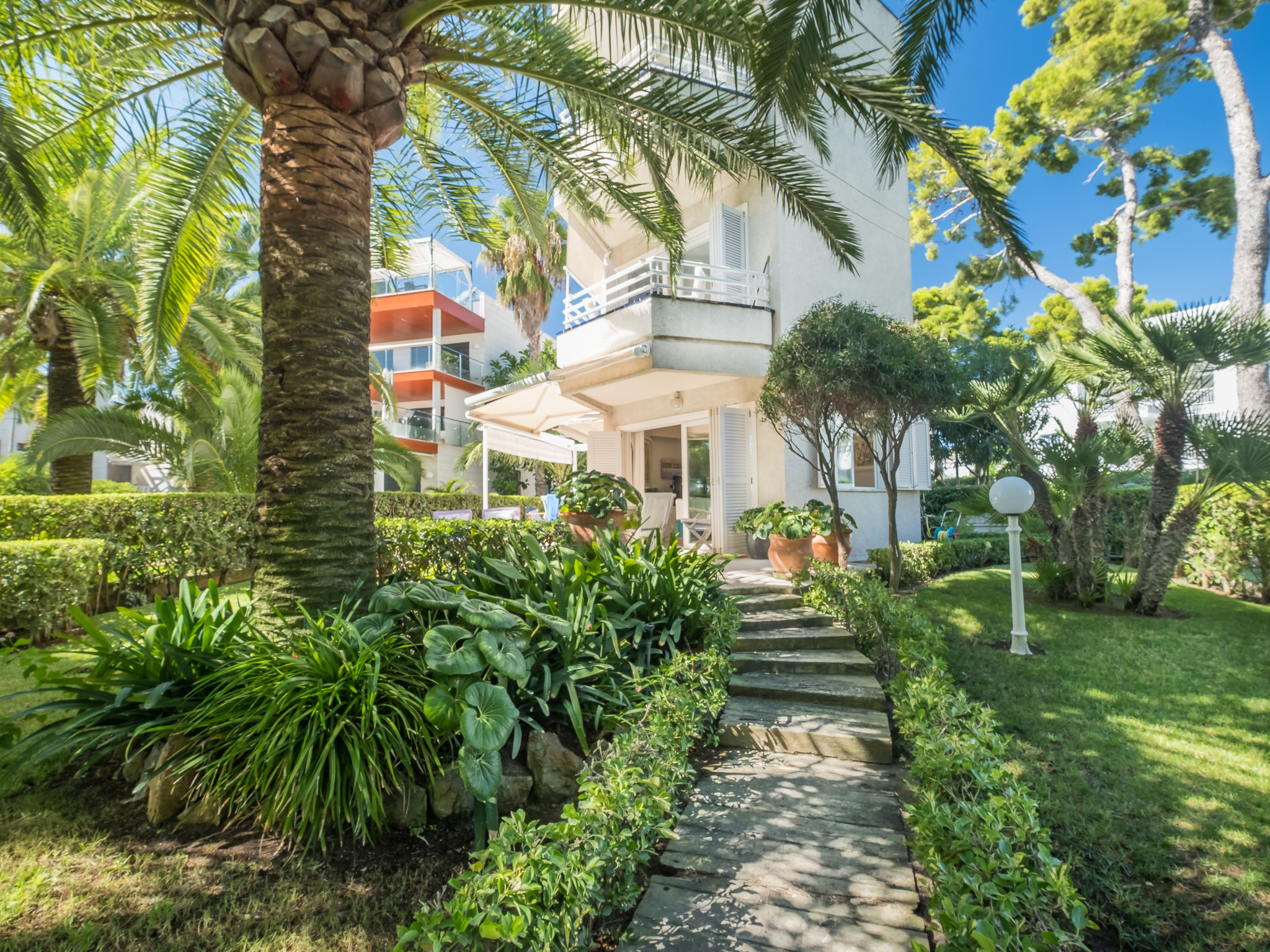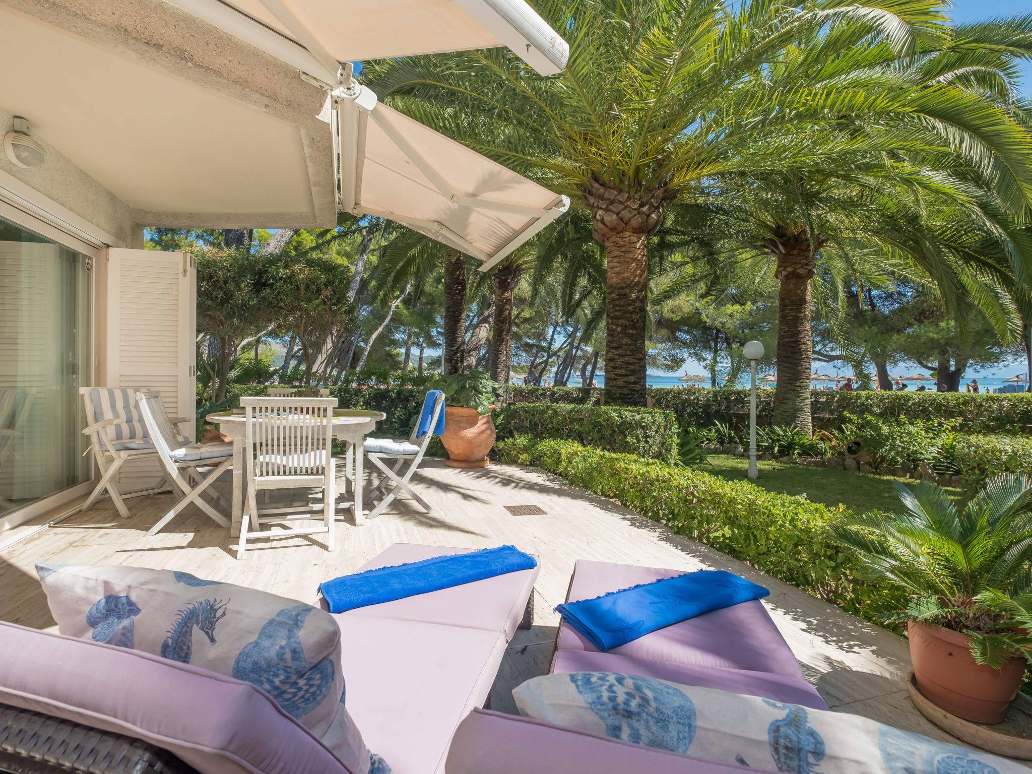 Port d'Alcudia: Very beautiful, cosy apartment block "Minerva Sea Views". In the resort, 500 m from the centre, in a sunny position, 2 km from the edge of the forest, 4 m from the beach, direct access to the beach. Private: beautiful garden with lawn and wildlife garden. Outdoor shower, patio, arbour, garden furniture. In the house: internet access, WiFi, air conditioning, laundry, washing machine. Public car park, public parking on the road. Shop, supermarket 200 m, restaurant, bar 50 m, bakery 200 m, pedestrian zone 3 m, bicycle rental 250 m, pub garden 50 m, 10 minute walk to the centre, bus stop 250 m, sandy beach "Port Alcudia Beach" 4 m, rocky beach "Aucanada" 6 km. Sports harbour 1 km, marina 1 km, golf course (18 hole) 6 km, tennis 1 km, minigolf 80 m, riding stable 2 km, sports centre 10 km, children's playground 150 m. Please note: suitable for families, suitable for seniors. Object suitable for 4 adults groups of teenagers on request only.Availability