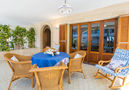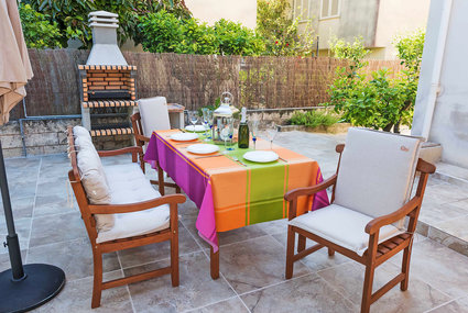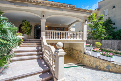 Port d'Alcúdia: Large, child friendly, comfortable semi-detached house "Can Roses", 2 storeys, semi-detached. In the resort, in a busy, sunny position, 2 km from the edge of the forest, 150 m from the sea, 150 m from the beach, 500 m of lagoon. Private: beautiful, well-kept garden with lawn and flowers. Outdoor shower, patio (150 m2), arbour, pergola (20 m2), barbecue. In the house: WiFi, air conditioning, washing machine, tumble dryer. Parking at the house. Shop, grocery 150 m, supermarket 500 m, restaurant 150 m, bar 150 m, bicycle rental, pub garden 200 m, bus stop 50 m, sandy beach 150 m pebble beach 6 km, shingle beach 6 km, rocky beach 6 km. Sports harbour 4 km, marina 4 km, golf course (18 hole) 6.5 km, tennis 600 m, minigolf 2 km, riding stable 1.5 km, sports centre 3 km, cycle lane 2 km, children's playground 1 km. Please note: suitable for families, suitable for seniors. Object suitable for 8 adults groups of teenagers on request only. Loading and unloading of baggage is possible at the holiday house. Main road close by 100 m from the property. Nightclub/disco 2 km from the property.Availability